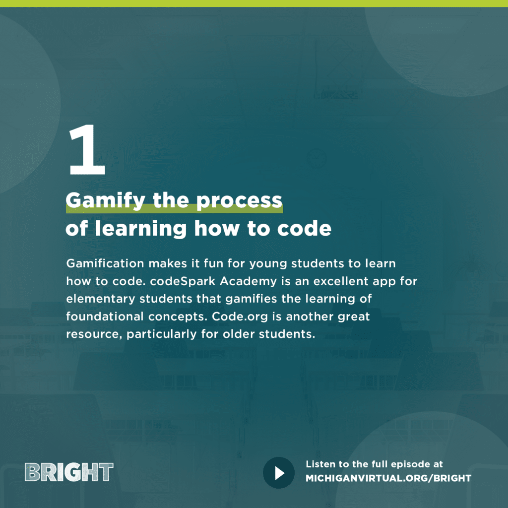 Gamification makes it fun for young students to learn how to code. codeSpark Academy is an excellent app for elementary students that gamifies the learning of foundational concepts. Code.org is another great resource for older students.