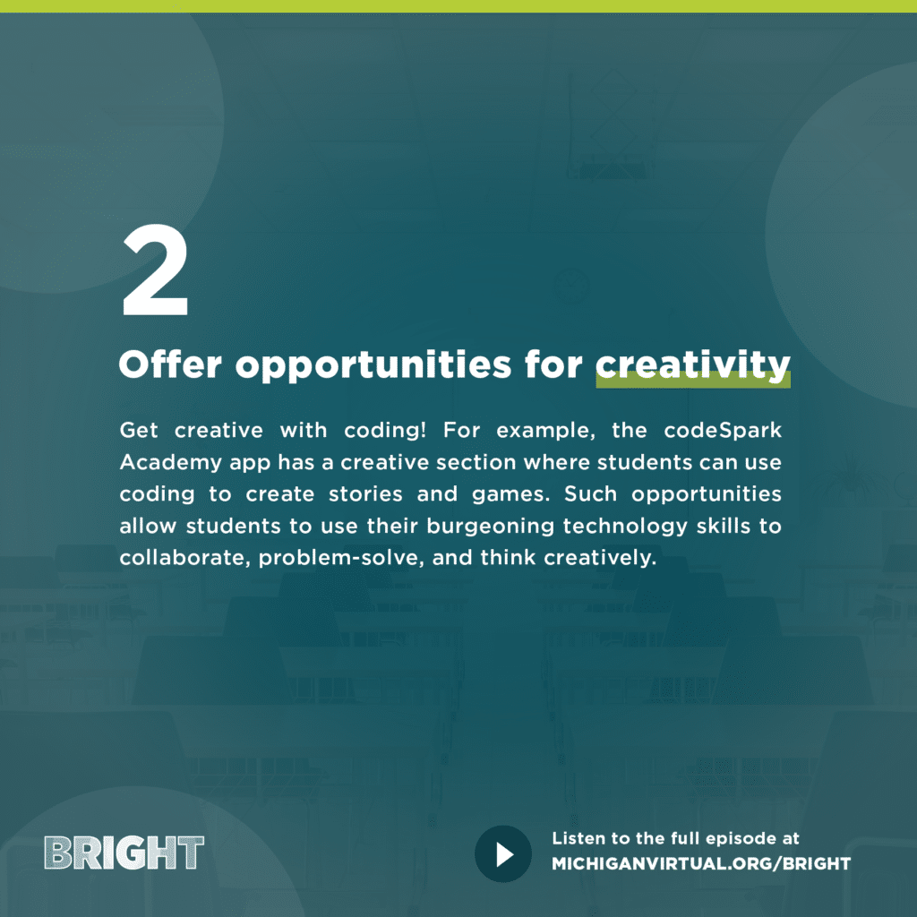Get creative with coding! For example, the codeSpark Academy app has a creative section where students can use coding to create stories and games. Such opportunities allow students to use their burgeoning technology skills to collaborate, problem-solve, and think creatively.