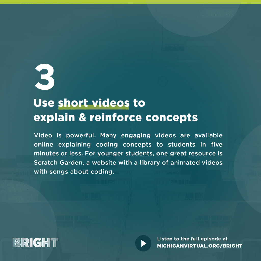 Video is powerful. Many engaging videos are available online explaining coding concepts to students in five minutes or less. For younger students, one great resource is Scratch Garden, a website with a library of animated videos with songs about coding.