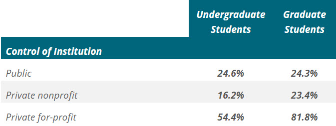 Based on the data collected for 2012-13, Table 311.15 (p. 453) displays the percentage of undergraduates who took any distance education courses in Fall 2012 was 25.8%, while 11.3% exclusively took distance education courses. In general, 24.6% of undergraduates students from public institutions at least one distance education course, but this ranged from 21.8% for public 4-year institutions up to 27.3% for public 2-year institutions. The range was even larger for private institutions. Only 16.2% of students attending private, nonprofit institutions took at least one distance education course compared to 54.4% of those attending private, for-profit institutions.