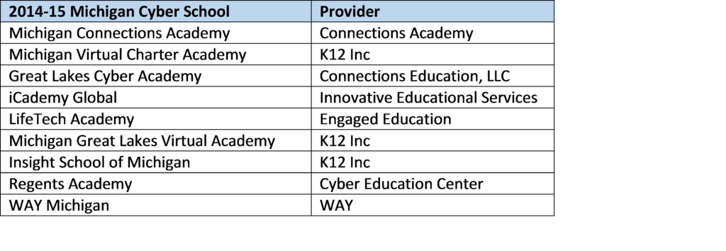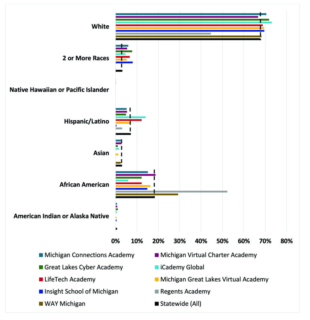 In April 2017, the National Education Policy Center (NEPC), released its fifth annual report on virtual schools in the U.S, Virtual Schools in the U.S. 2017. In it, the authors provide “objective analysis of the characteristics and performance of full-time, publicly funded K-12 virtual schools; available research on virtual school practices and policy; and an overview of recent state efforts to craft new policy.” (Molnar, 2017, p. 3) The full report is available free online at http://nepc.colorado.edu/publication/virtual-schools-annual-2017.In Section I of the report, authors Gary Miron, Charisse Gulosino, Christopher Shank, and Caryn K. Davidson state that virtual schools served a higher proportion of girls than boys and “[r]elative to national public school enrollment, virtual schools had substantially fewer minority students and fewer lower-income students.” (Miron, et. Al, 2017, p. 3) Additionally, the research team found that the proportion of special education students and students with disabilities in virtual schools was close to the national average for all U.S. public schools. Lastly, the proportion of students classified as English Language Learners enrolled in virtual schools nationwide was considerably less than the proportion in all public schools.Given that these findings were based on national data, the research team at MVLRI was interested in how those general findings aligned with virtual schools within the state of Michigan. (A similar analysis was performed by MVLRI in 2015) To find out, MVLRI used the MI School Data website (https://mischooldata.org) to look up these same metrics using information available to the public. MVLRI researched nine schools identified by the state of Michigan as statewide cyber schools for which there was data available for the 2014-15 school year. These nine schools were: