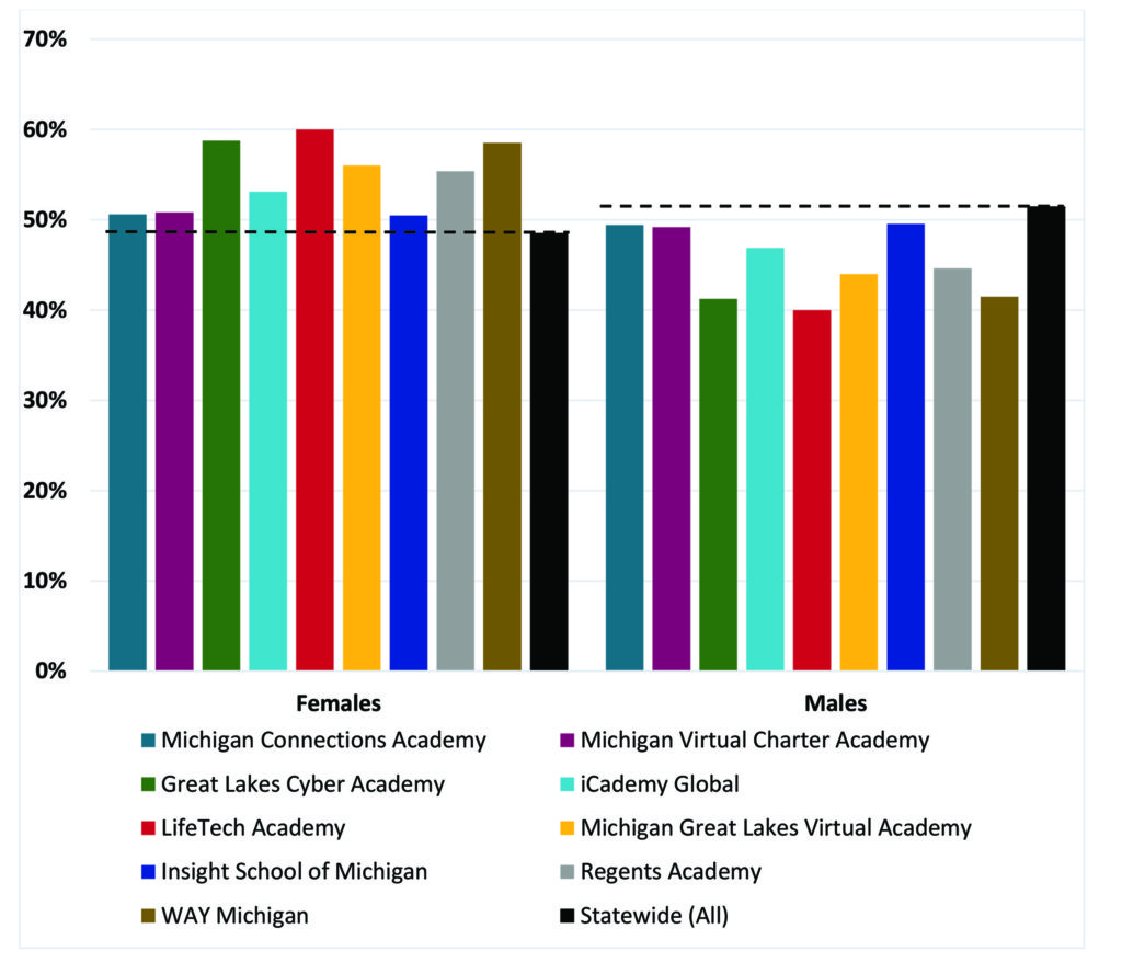 National Finding #1 – Virtual schools were skewed in favor of girls.Michigan Finding #1 – Based on data for the 2014-15 school year, all nine virtual schools had higher proportions of female students than the statewide average. See Figure 1.Figure 1. Gender Distribution of Michigan Cyber School Students by School