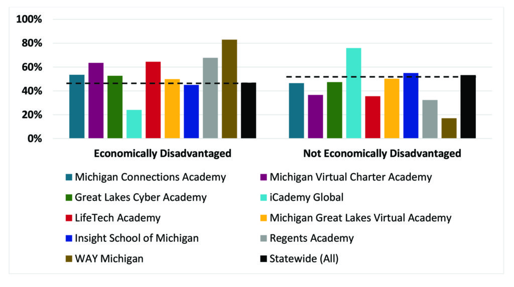 National Finding #3 – Virtual schools had fewer low-income students.Michigan Finding #3 – Based on data for the 2014-15 school year, seven of the nine virtual schools had higher proportions of low-income students than the statewide average. See Figure 3.Figure 3. Economically Disadvantaged Distribution of Michigan Cyber School Students by School