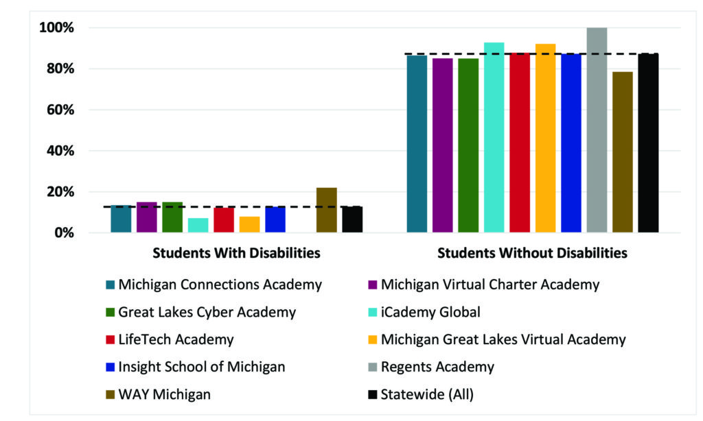National Finding #4 – Virtual schools had a similar number of students with disabilities.Michigan Finding #4 – Based on data for the 2014-15 school year, four of the nine virtual schools had higher proportions of students with disabilities than the statewide average. See Figure 4.Figure 4. Students with Disabilities Distribution of Michigan Cyber School Students by School