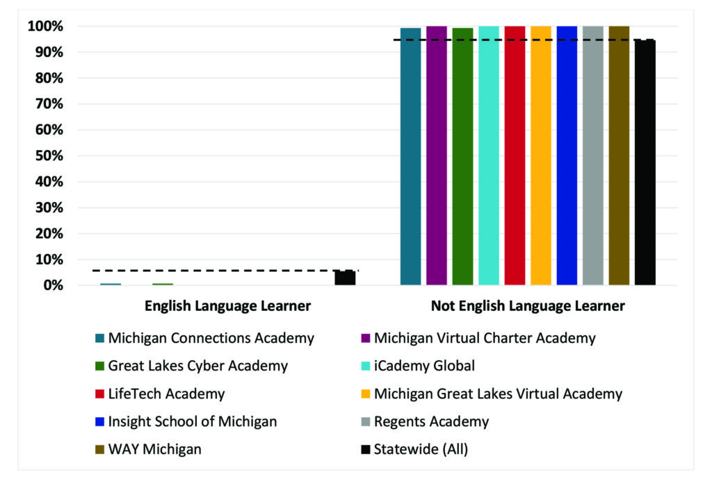 National Finding #5 – Virtual students had fewer students classified as English Language Learners.Michigan Finding #5 – Based on data for the 2014-15 school year, all nine virtual schools had fewer students classified as English Language Learners than the statewide average. See Figure 5.Figure 5. English Language Learner Distribution of Michigan Cyber School Students by School