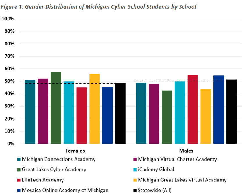 On March 10, the National Education Policy Center (NEPC), released its third annual report on virtual schools in the U.S. In this report, entitled Virtual Schools in the U.S. 2015, the authors tackle subjects such as key policy issues in virtual schools, existing research to guide policy, and statistics on the number of virtual schools, demographics about who attends them, and comparison measures against national statistics for students attending traditional brick and mortar schools.In summarizing key points about full-time virtual schools, authors Gary Miron and Charisse Gulosino state that virtual schools served a higher proportion of girls than boys and “[r]elative to national public school enrollment, virtual schools had substantially fewer minority students, fewer low-income students, fewer students with disabilities, and fewer students classified as English language learners.”Given that these findings were based on national data, the research team at MVLRI was interested in how those general findings aligned with virtual schools within the state of Michigan. To find out, MVLRI used the MI School Data website (https://mischooldata.org) to look up these same metrics using information available to the public. MVLRI looked up the data for seven schools identified by the state of Michigan as cyber schools. These seven schools were: [table id=4 /]*Mosaica Online Academy of Michigan has since changed its name to Mackinac Preparatory AcademyNational Finding #1 – Virtual schools were skewed in favor of girls.Michigan Finding #1 – Based on data for the 2013-14 school year, five of the seven virtual schools had higher proportions of female students than the statewide average. See Figure 1.