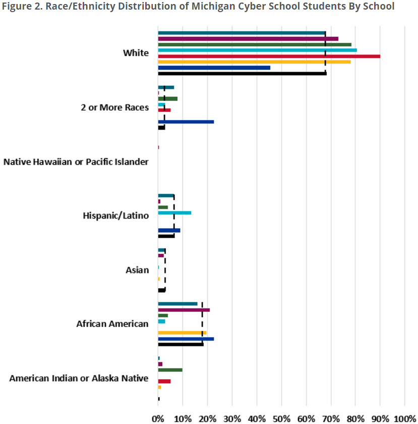 National Finding #2 – Virtual schools had substantially fewer minority students.Michigan Finding #2 – Based on data for the 2013-14 school year, five of the seven virtual schools had fewer minority students than the statewide average. See Figure 2.