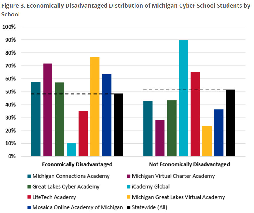 National Finding #3 – Virtual schools had fewer low-income students.Michigan Finding #3 – Based on data for the 2013-14 school year, five of the seven virtual schools had higher proportions of low-income students than the statewide average. See Figure 3.