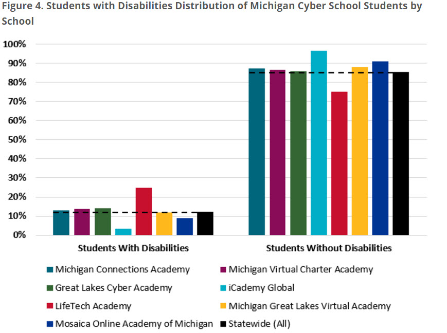 National Finding #4 – Virtual schools had fewer students with disabilities.Michigan Finding #4 – Based on data for the 2013-14 school year, four of the seven virtual schools had higher proportions of students with disabilities than the statewide average. See Figure 4.