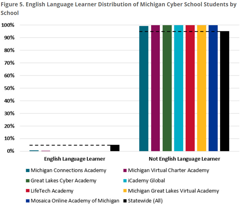 National Finding #5 – Virtual schools had fewer students classified as English Language Learners.Michigan Finding #5 – Based on data for the 2013-14 school year, all seven virtual schools had fewer students classified as English Language Learners than the statewide average. See Figure 5.