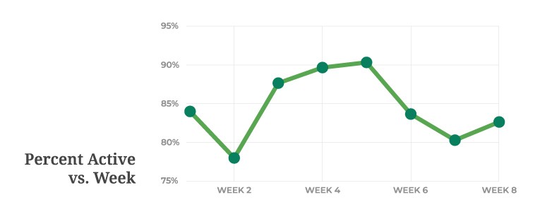 Figure 1 shows the average percentage of active students per week. From week to week, participation ranged from about 71% to 91%. There was no clear trend, with participation fluctuating from week to week but overall staying relatively high between approximately 80 and 90%. The largest gain was seen from weeks 2 to 3 of 9.7%, while the largest loss happened between weeks 5 and 6 of about 6.7%.