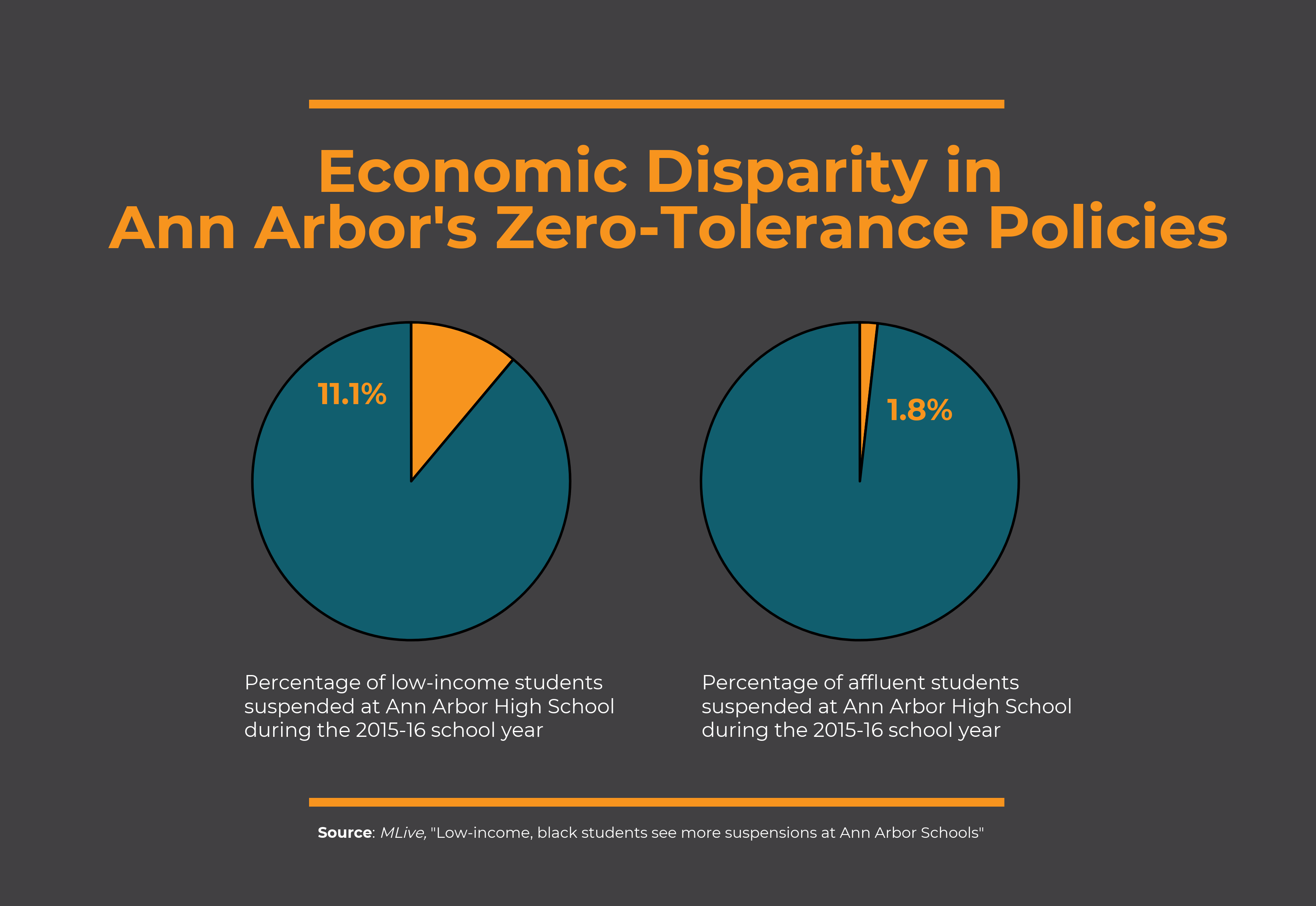 You can find research supporting these trends here, here, and here.Unfortunately, Michigan schools are not free from these disparities. In 2017, for example, Ann Arbor Public Schools performed an investigation into their own zero-tolerance policies and found that 11.1 percent of low-income students were suspended during the 2015-16 school year, as compared to only 1.8 percent of affluent students.