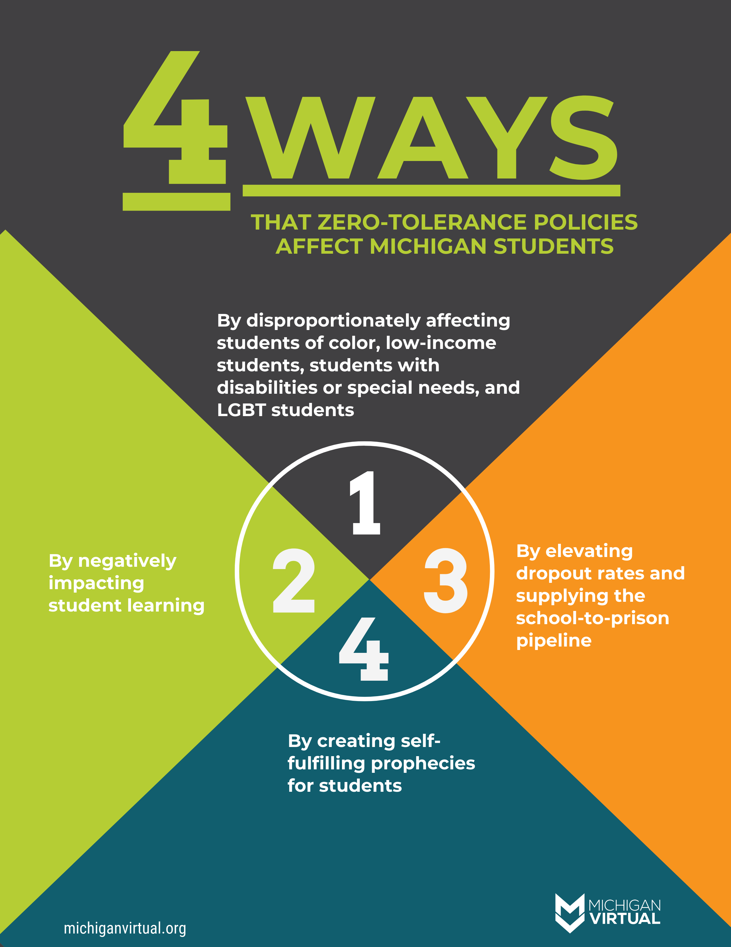 In December 2016, Gov. Snyder signed a bill asking schools to consider using restorative practices in place of zero-tolerance policies like suspension and expulsion.Zero-tolerance policies are exactly what they sound like:They're no-nonsense forms of school discipline where students are removed from school for committing infractions that are deemed unacceptable.Historically, these policies were designed to keep schools and students safe by protecting students from dangers like drug use, gang affiliation and violence. While the intentions were noble, critics of these policies point to the array of unintended outcomes that have done more harm than good.Why are educational leaders pushing for restorative justice?It's a paradigm shift away from zero tolerance and toward a system rooted in values of respect, accountability, healing and empathy.This shift toward restorative justice is a topic we will continue to cover in future installments of our blog series on Restorative Justice in Michigan Schools. There’s a wealth of research telling us that zero-tolerance policies don’t work. The law is just now beginning to catch up.Here are four ways that zero tolerance negatively affects students: