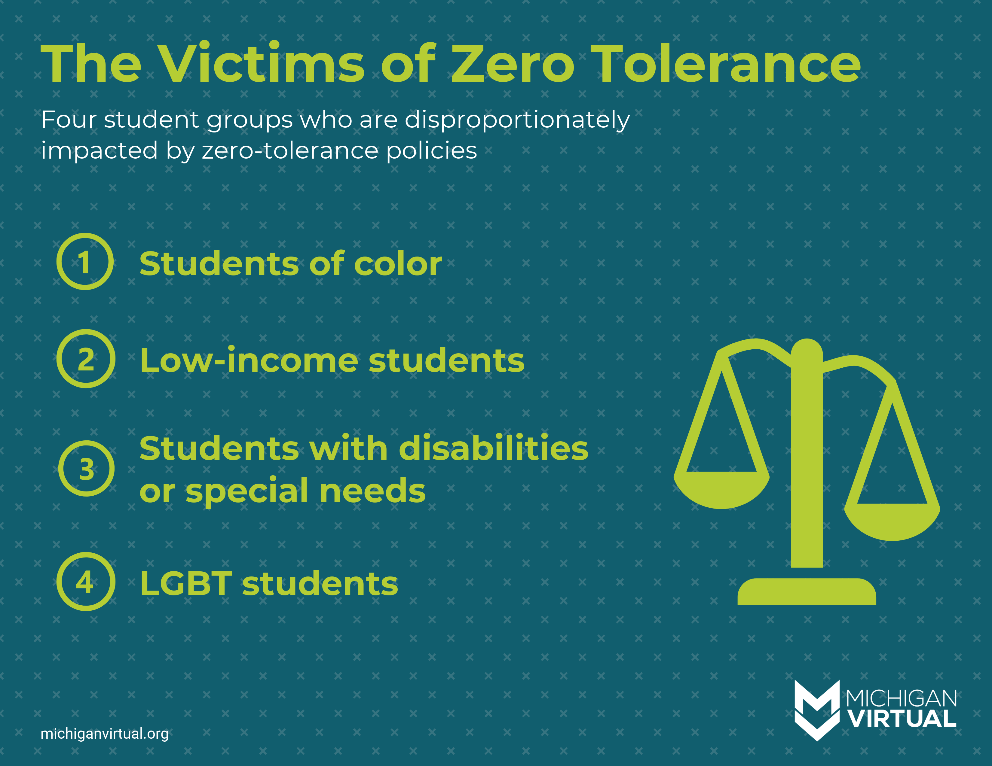 The evidence is nearly undeniable. Zero-tolerance policies do not affect all student groups equally. In fact, certain groups of students are dramatically more likely to be punished or removed from school under the reign of zero tolerance.The victims of zero-tolerance policies include: