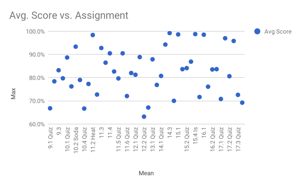 Chemistry teachers have always known that stoichiometry is one of the toughest units for a first year chemistry student; this was confirmed by data gathered from the 2016-17 school year. The score of the first quiz (9.1) is the starting point for stoichiometry and often reflects students’ overall success in the stoichiometry unit. Figure 1 illustrates that the average score for the 9.1 Quiz is one of the lowest in the entire course.