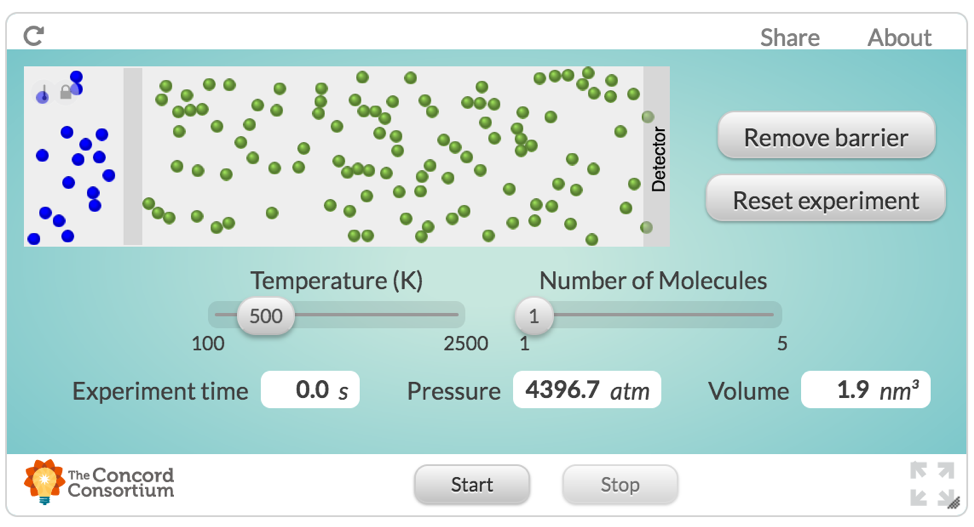 The aim of this activity was to provide the chance for students to be introduced to the simulation and have time to tinker with it. In this activity, students accessed the simulation (available here and presented in Figure 1) and responded to questions that prompted them to generate ideas about what they understood about how temperature, pressure, and volume are related, and what they thought would happen in the simulation both before and after tinkering with it.Figure 1. The Lab Interactive simulation that we designed for this study based on an existing simulation about the diffusion of molecules.