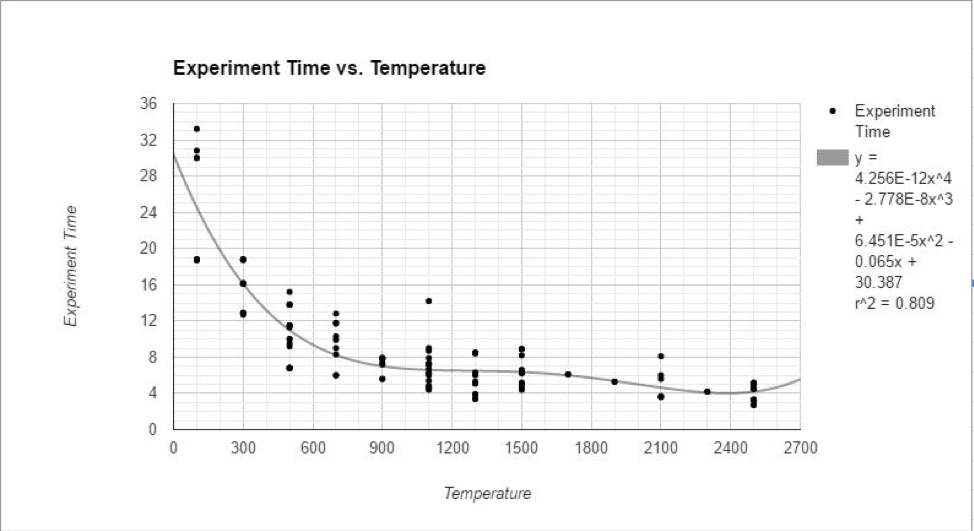 Though based on activities completed in only one semester, we found that students were able to demonstrate capabilities that can be beneficial to their learning. For example, in the third activity, students were asked to consider how simple models are often preferred in science because they are more easily interpretable. One student, in an impressive response (the graph from which is presented in Figure 2), wrote, “I used this 4th power polynomial function because it had a much higher R2 value than the linear, exponential, and lower degree functions.” This student concluded that a 4th-degree polynomial was the most appropriate model, as “Having a polynomial function with a higher degree of 4 makes it really laborious to manipulate and use to predict values.” While this is only one response from one student, other responses suggest that the complex, messy data that students generated and then used as part of a class dataset provided a context to consider sophisticated aspects of modeling data.Figure 2. Example data model created by a student as part of an explanation of the relationship between temperature and time.