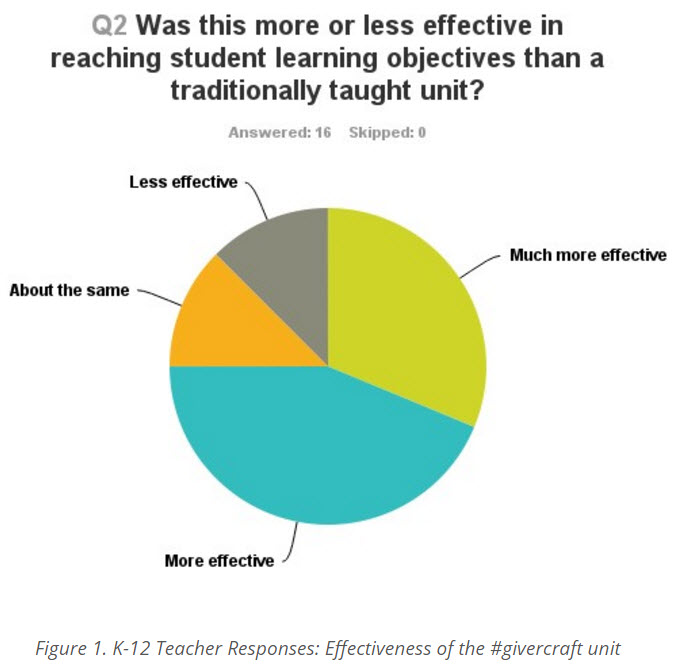 According to sixteen K-12 teacher responses at the end of the experience, 100% of the students who participated were “Highly Engaged” (as opposed to Somewhat Engaged, Rarely Engaged or Not Engaged). Seventy-four percent of participants believed that the Level Two instructional unit was well-aligned with Common Core standards, while 26% percent believed the unit “might” be well aligned with Common Core standards and none indicated the unit wasn’t aligned with Common Core Standards. In addition, 64% percent of participants believed that the rubric was valid, while 36% percent believed that while students learned something, their learning was not aligned with the rubric, and none believed the rubric was not valid. As outlined in Fig. 1, 75% of respondents found the #givercraft unit More Effective or Much More Effective than a traditionally taught unit. Twelve percent found the unit As Effective, and 12% found the unit Less Effective.