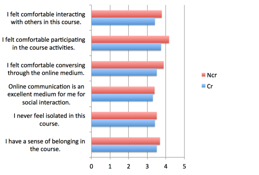 In summation, CR students showed statistically lower social presence on all six sub-scales compared with NCR students. Specifically, CR students showed statistically lower affective communication when we asked whether they felt comfortable interacting with others in this course, whether they felt comfortable participating in the course activities, and whether they felt comfortable conversing through the online medium.