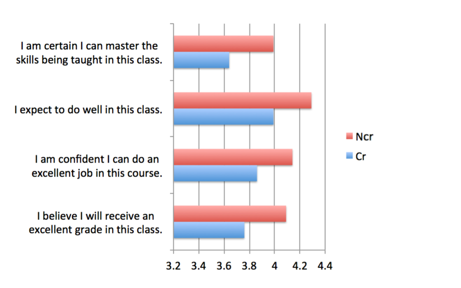 In summation, CR students showed lower self-efficacy in achieving success in their online classes, compared with NCR students. They did not feel confident in mastering the skills in class and did not expect to do well and receive an excellent grade.