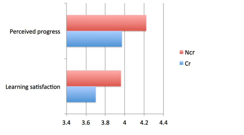 We measured learning satisfaction and perceived progress as two learning outcomes. Again, the chart below suggested that CR students rated their learning satisfaction with and perceived progress in the course lower compared with NCR students.