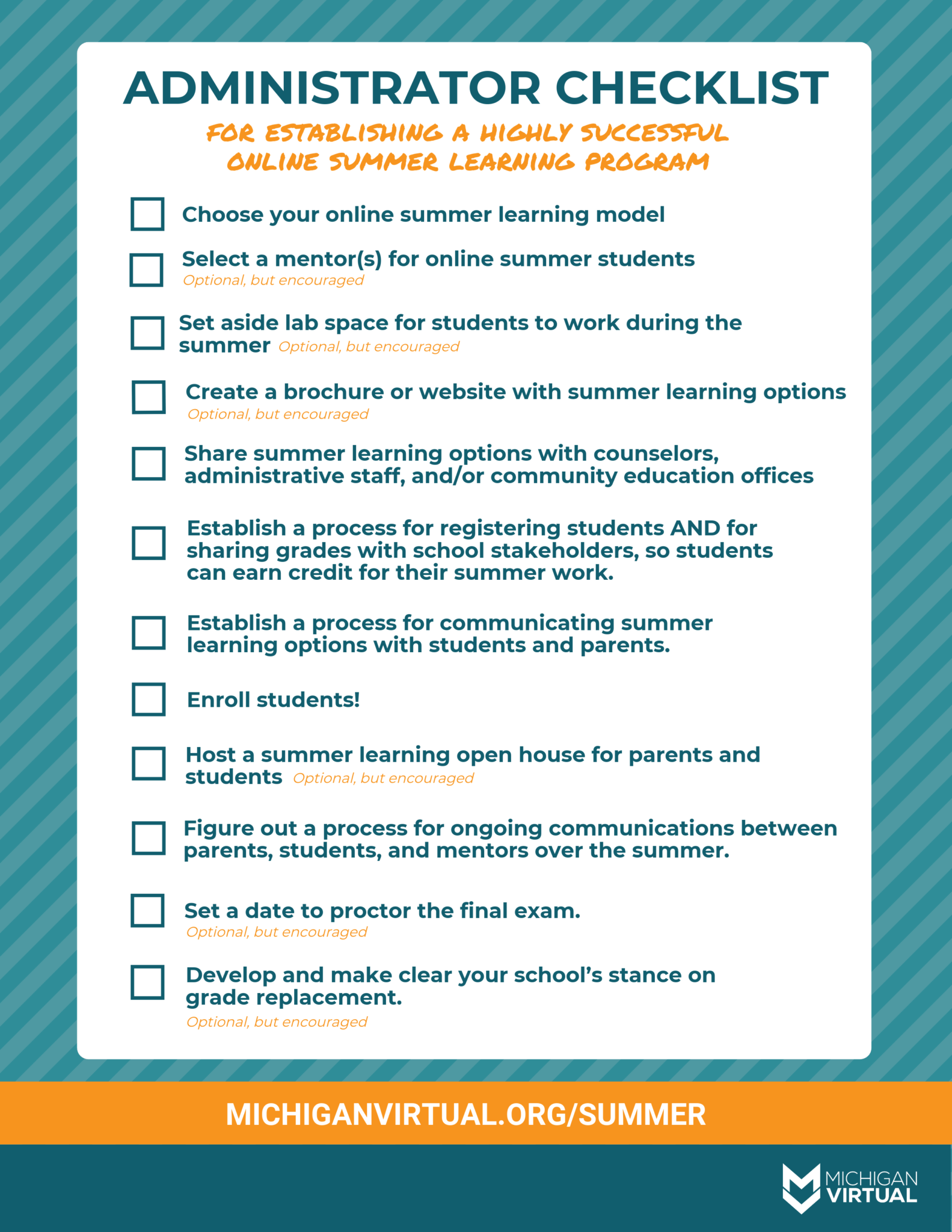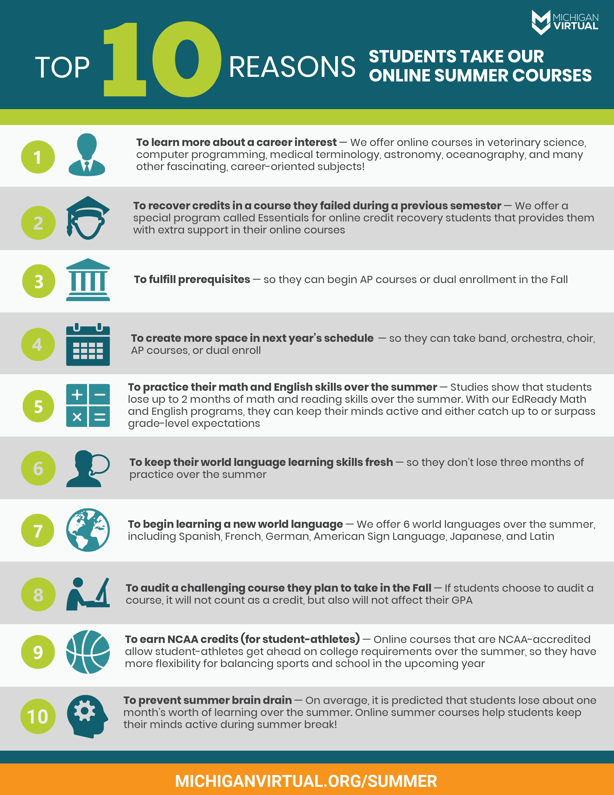 This summer, we’re offering online courses on over 150 different subjects, including core areas (i.e., science, math, English, and social studies), as well as a myriad of fascinating, career-oriented electives. Students have 10 weeks to complete summer coursework at their own pace and will be supported along the way by a highly qualified, Michigan-certified online instructor who is an expert in their subject area. These courses provide a flexible opportunity for students to recover credits or fulfill requirements in advance of graduation while keeping their minds active over the summer!You can learn more about our summer learning options at michiganvirtual.org/summer