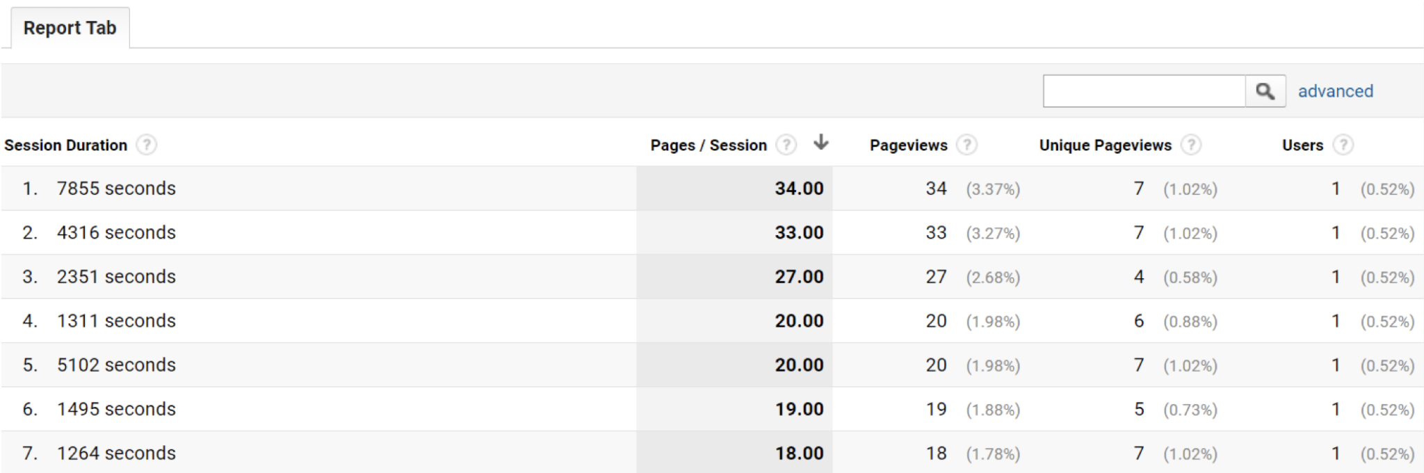 This course level data informed the team’s understanding of engagement in the course lesson but left questions about how individual students progressed through the course. To understand this, the team next analyzed the behavior of individual users as they moved through the lesson pages. One technical note here: GA is not designed to provide this kind of data on the behavior of individual users; however by using custom reporting features sorted by session duration, which was unique for each visit, we were able to parse the data to measure the behavior of individual students in the lesson. This custom data allowed the team to determine the total time that students spent in a given lesson as well as the number of lesson pages that student viewed during the same visit.In GA, we generated a custom report which sorted the data by the length of the session (session duration). See Image 1 below for a screenshot. Since the chances of two visits (counted in seconds) being exactly the same length were extremely unlikely, this allowed us to parse the data to measure the behavior of individual students. The custom report contained additional fields such as the number of non-unique pages viewed during the session, the number of unique page views, and the number of users with this exact session duration (which was often, but not always, equal to exactly one).
