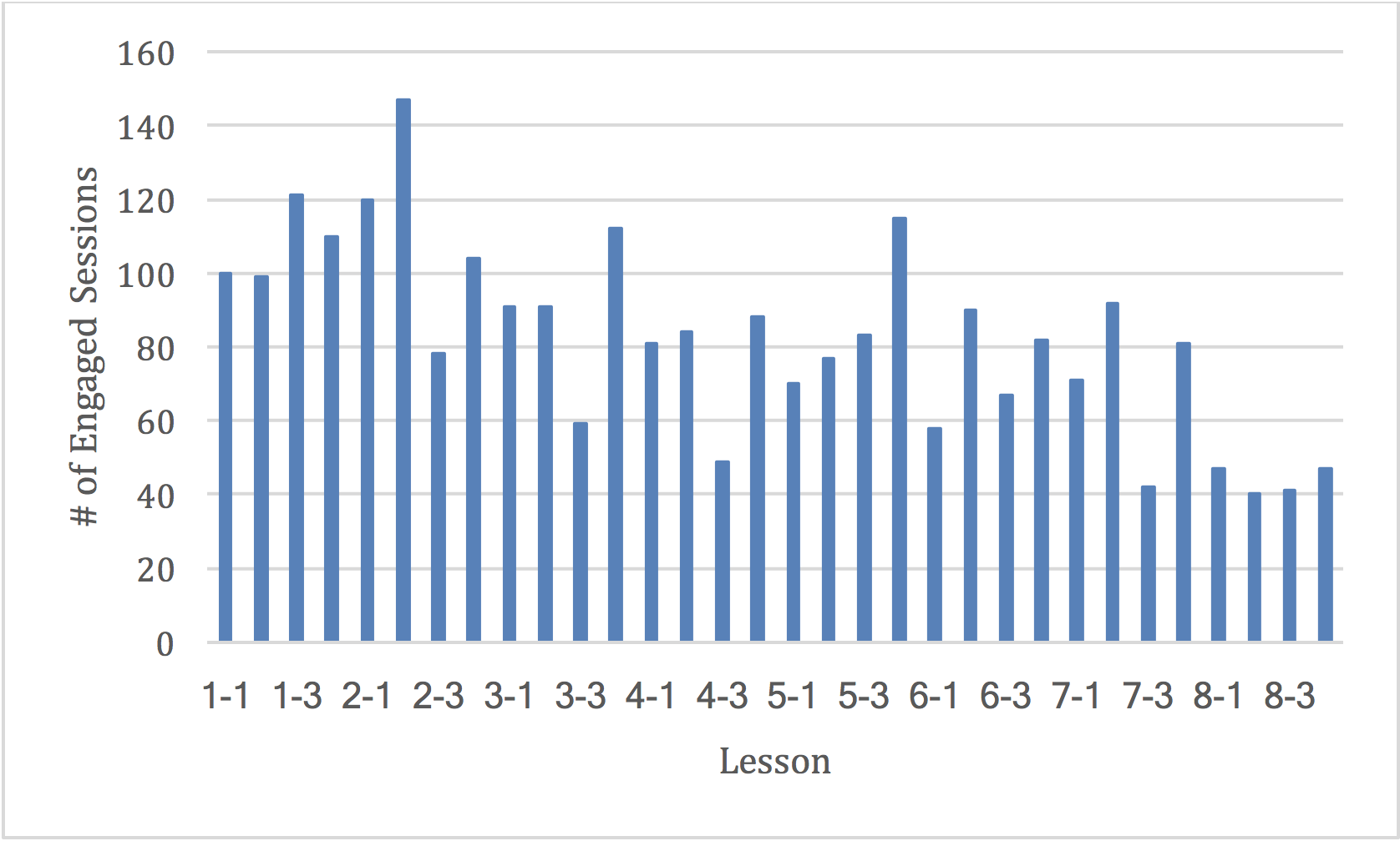 Ultimately, the course designers — experts in the course content — determined that appropriate criteria for an engaged session would be viewing at least half of the lesson pages and spending at least four minutes in the lesson. Using these criteria, we counted the number of engaged sessions in each lesson of the courses we monitored. Sample data is provided below for one of the courses.