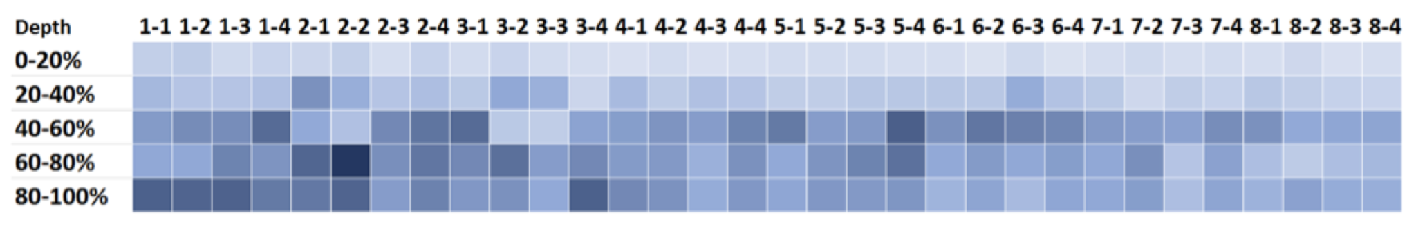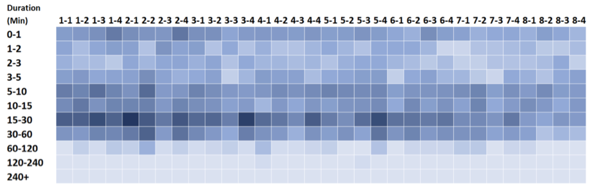 Parsing the data this way illustrated that there was clear variation in student engagement from lesson to lesson, as well as a general trend toward lower engagement as students progress through the course. The data also revealed that some lessons represented “hot spots” for student engagement while others represent “cool spots.” That is to say, there were particular lessons in the course that had seemingly higher engagement overall and some lessons with lower engagement overall.Given our findings of engagement lesson-by-lesson, we wanted to identify a better method for visualizing hot and cold spots of student engagement within a course. Using color intensity to represent the number of students, with dark blue denoting more students and light blue fewer students, we produced the heat maps for page depth and session duration, show below. For both maps, as you move downward vertically in the chart, you move toward greater engagement. As you move horizontally to the right, you move to later lessons in the course.