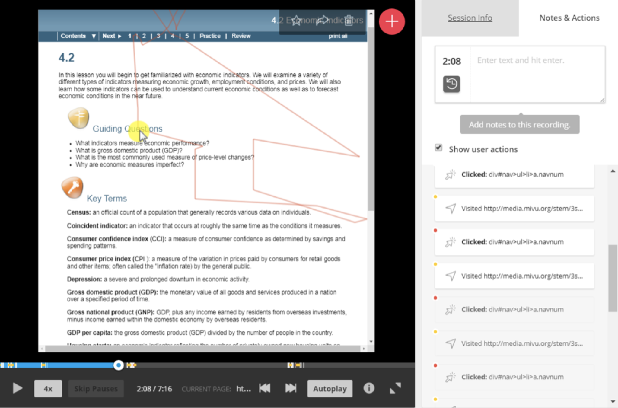 During the research time period, we learned of a new user-tracking tool called Hotjar. When embedded in a web page, Hotjar anonymously tracks user (in our case student) activity on a specific page including cursor motion, scrolling, clicking, and timestamps. The data is used to record screen capture videos of the users’ activity on the page and produce aggregated heat maps of user behavior (specifically where users tend to click on the page most frequently).Hotjar requires a tracking code be inserted into the <head> tag of the lesson HTML pages. For this reason, the tool could only be used on lessons that were published to our local media server (as opposed to the cloud-based services we normally use for lesson hosting). Much like GA, Hotjar cannot track students as they move from one domain to another (say from Blackboard to our lesson pages); but unlike GA, Hotjar is designed to track individual students to understand their behavior while in the lesson pages.We selected two lessons — one from each of our monitored courses — to be hosted on our media server with embedded Hotjar tracking codes. The result was a collection of screen recordings that showed the behavior of individual students as they moved through these lessons. See Image 2 below for a screenshot. In one semester, we captured hundreds of these recordings, ranging from a few seconds to over an hour. The recordings move beyond the basic data of page views and session duration captured by GA (although Hotjar captures that data as well) and gives an intimate perspective on how students navigate through the lesson content.