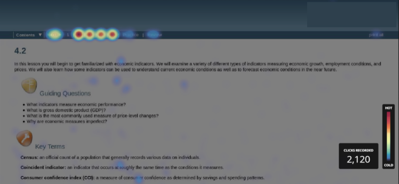 Hotjar recordings play like a fast-forwarded movie, showing the motion of the user’s cursor and highlighting specific actions such as page clicks and scrolls.The individual screen recordings are overwhelmingly detailed and difficult to aggregate into useful information. However, Hotjar also provides a “heat map” feature which presents the hot spots within a lesson page where students are clicking the most frequently. See Image 4 below.