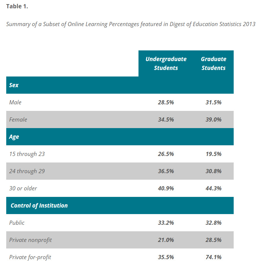 Based on the data collected through these questions, Table 311.20 (p. 454) displays the percentage of undergraduates who took any online classes in 2011-12 was 32.0%, while 8.4% exclusively took online courses. A higher proportion of female undergraduates took any online courses (34.5%) compared to their male counterparts (28.5%). Age was positively correlated with the percentage of undergraduates taking any online courses. Undergraduates ages 15 through 23 were found to have the lowest percentage taking at least one online course (26.5%). Undergraduates ages 24 through 29 had a rate of 36.5%, whereas those ages 30 and older had the highest proportion (40.9%) taking any online courses. There was also variation based on the control of the institution. Undergraduates from private, nonprofit institutions had the lowest percentage taking any online courses (21.0%); about a third of undergraduates from public institutions took any online courses (33.2%); and 35.5% of undergraduates from private, for-profit institutions took any online courses.