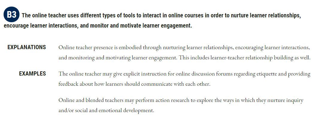 As you can see, these standards are fairly exhaustive in their coverage, including everything from digital citizenship to assessment and measurement. They walk you through best practices for teaching in the online environment. Each standard is broken down to include both explanations and examples, which can help online teachers better understand how they might implement each suggestion into their virtual classroom. For example: