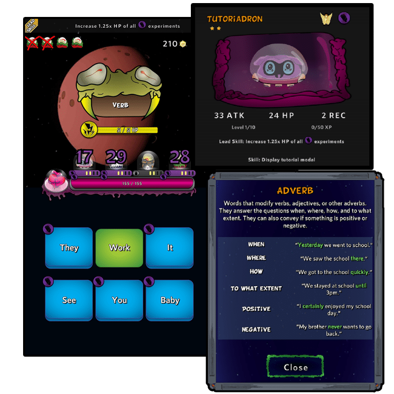 The space-themed mobile app GramMars Wars helps students strengthen their English grammar knowledge. Players complete quizzes to defeat aliens. The more you learn, the more you achieve.