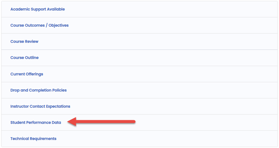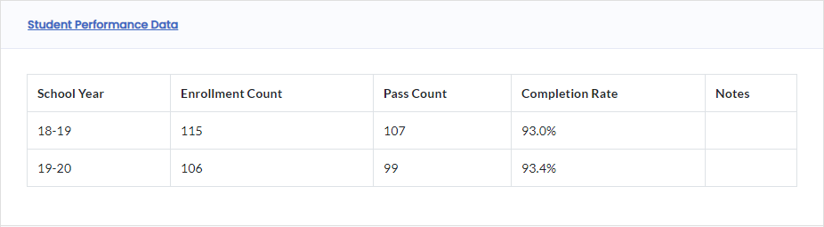 The catalog includes performance data from the preceding school year(s). This includes information on the number of enrollments from the prior year and the number of those enrollments that earned 60% or more of the total course points. The site also displays a completion rate for that year. Courses with no data from a previous year suggest the course was not offered during that year.To view the performance data for a course title, scroll down on the page and under the "Additional Course Information" heading, click on the "Student Performance Data" link to expand that subsection.Additional Course Information Section for Courses