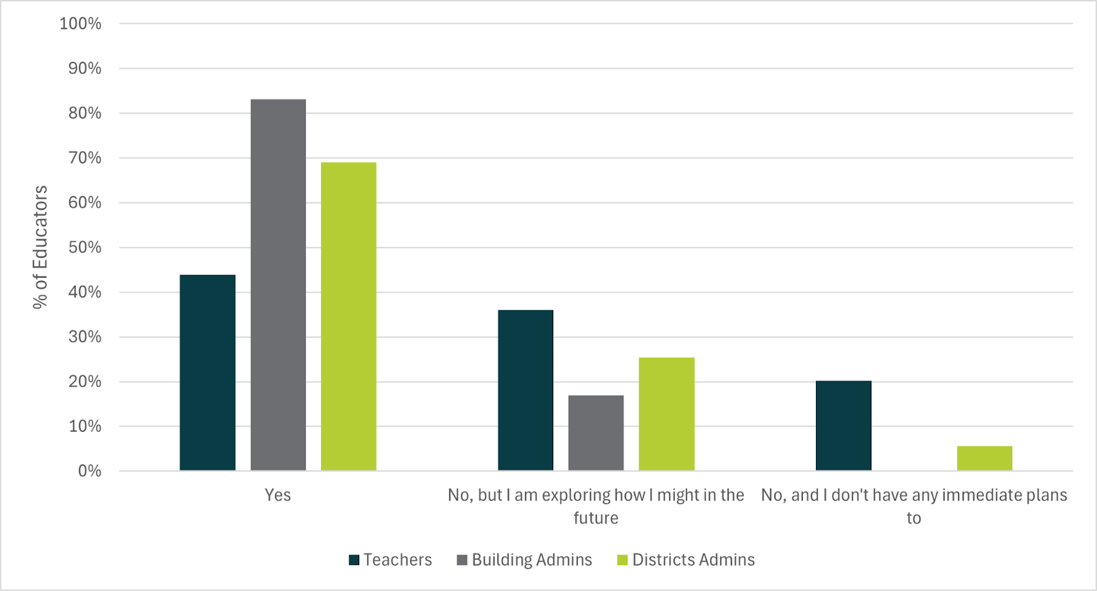 Similar to last year, for district administrators who reported that AI was not being used in their schools, those indicating that they were exploring future use of AI were considerably higher than those with no immediate plans to use AI. There were no building administrators who reported that AI was not being used in their schools, with no immediate plans to use AI. This finding is in line with data from last year, as well as the previously reported enthusiasm of building administrators to incorporate AI into their schools.