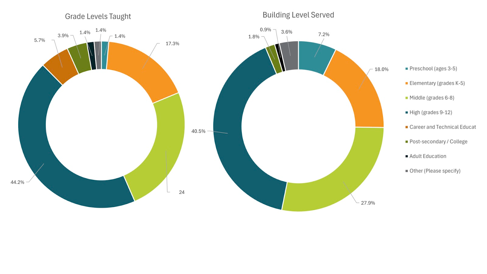Educators who indicated they were teachers or building principals/assistant principals were asked to identify the grade levels they currently taught or the building levels they currently served. Figure 2 below details these responses. Similar to the 2024 survey, elementary, middle, and high school teachers were well represented, with a smaller number of respondents in adult education, post-secondary/college, preschool, and career and technical education.