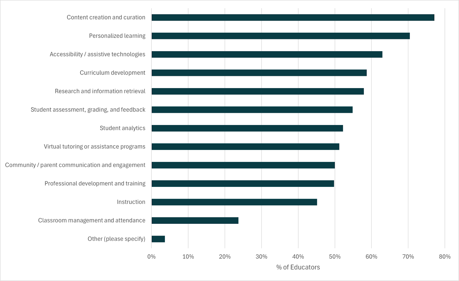 Educators reported feeling that AI would be a useful way to help them generate and curate content, personalize learning for students, and increase the accessibility of their content. AI’s utility for more interpersonal aspects of teaching (instruction, classroom management) was less commonly reported.