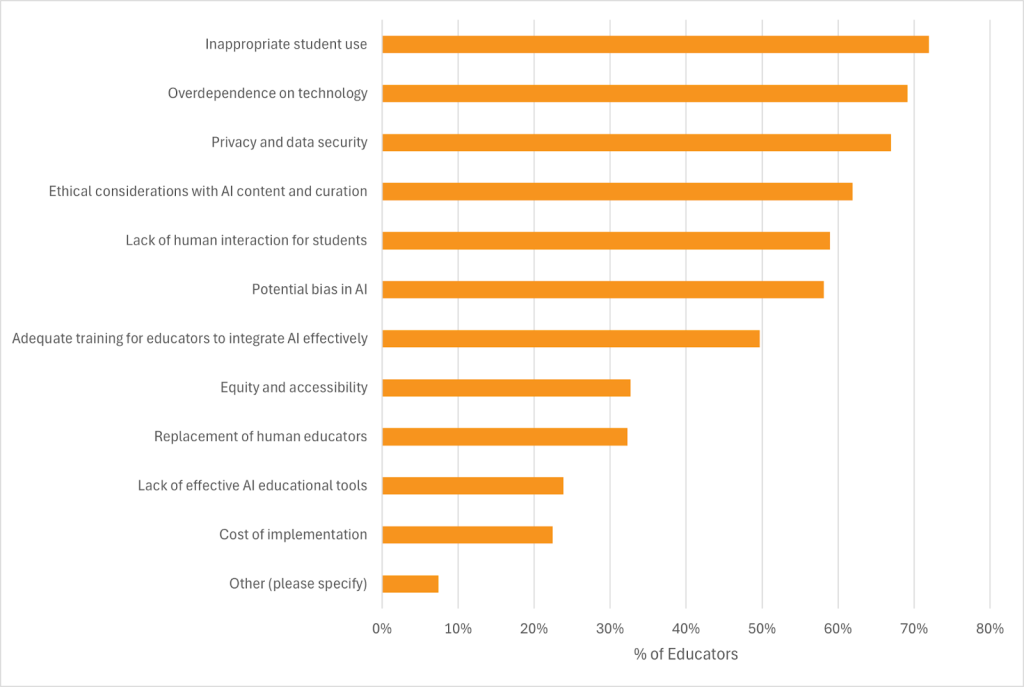 While educators have numerous concerns regarding AI, the most salient tend to be those relating to cognitive harm (inappropriate use, over-dependence) and ethics (privacy, bias). A lesser percentage were concerned about logistical elements such as cost.