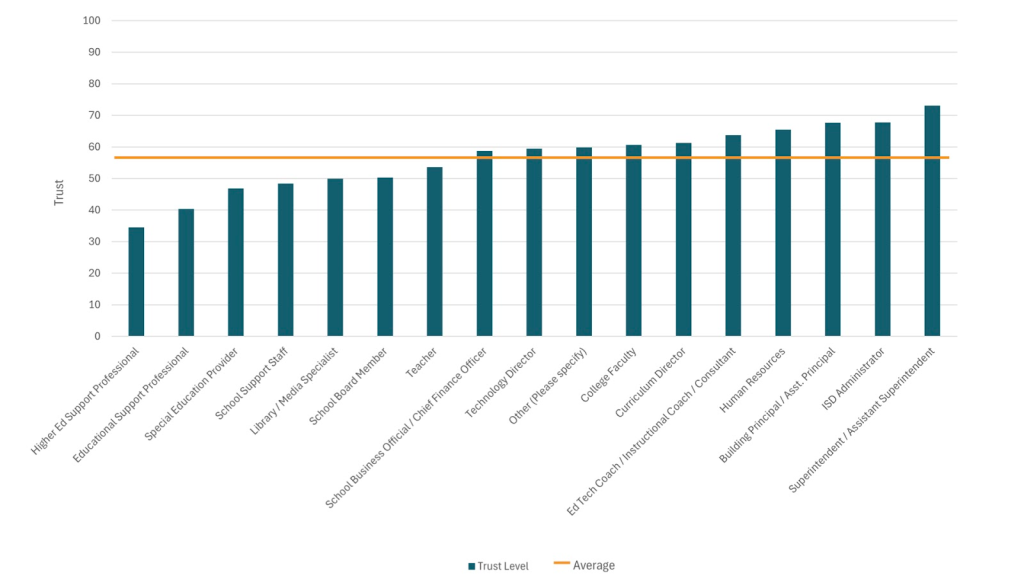 Figure 5 below details the level of trust by role relative to the average level of trust reported by all educators. Superintendents/assistant superintendents (73.0), ISD administrators (67.7), building principal/assistant principals (67.7), human resources (65.5), ed tech coach/instructional coach/consultant (63.8), curriculum director (61.3), college faculty (60.7), technology director (59.4), and school business official/chief finance officer (58.7) all reported levels of trust higher than the average (58.4). Similar to 2024, teachers' average trust (53.6) was below the average (58.4); however, trust did increase among teachers from an average of 43.7 in 2024.