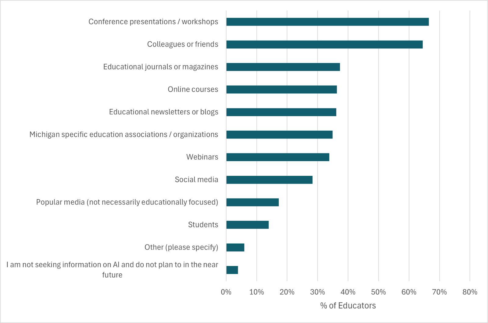 Additionally, educators were asked, Where would you turn (or have you turned) for information on artificial intelligence (AI)? Figure 3 below provides a summary of their responses. Among the most popular places educators turned to for information on AI were their colleagues or friends and conference presentations/workshops, with over half of educators indicating that they used either or both. This finding is aligned with the previous year's survey, as well as previous research that found educators preferred informal peer mentoring as well as options such as conferences, webinars, and online courses. In line with last year’s results, far fewer educators reported using sources like popular media or students for information on AI.