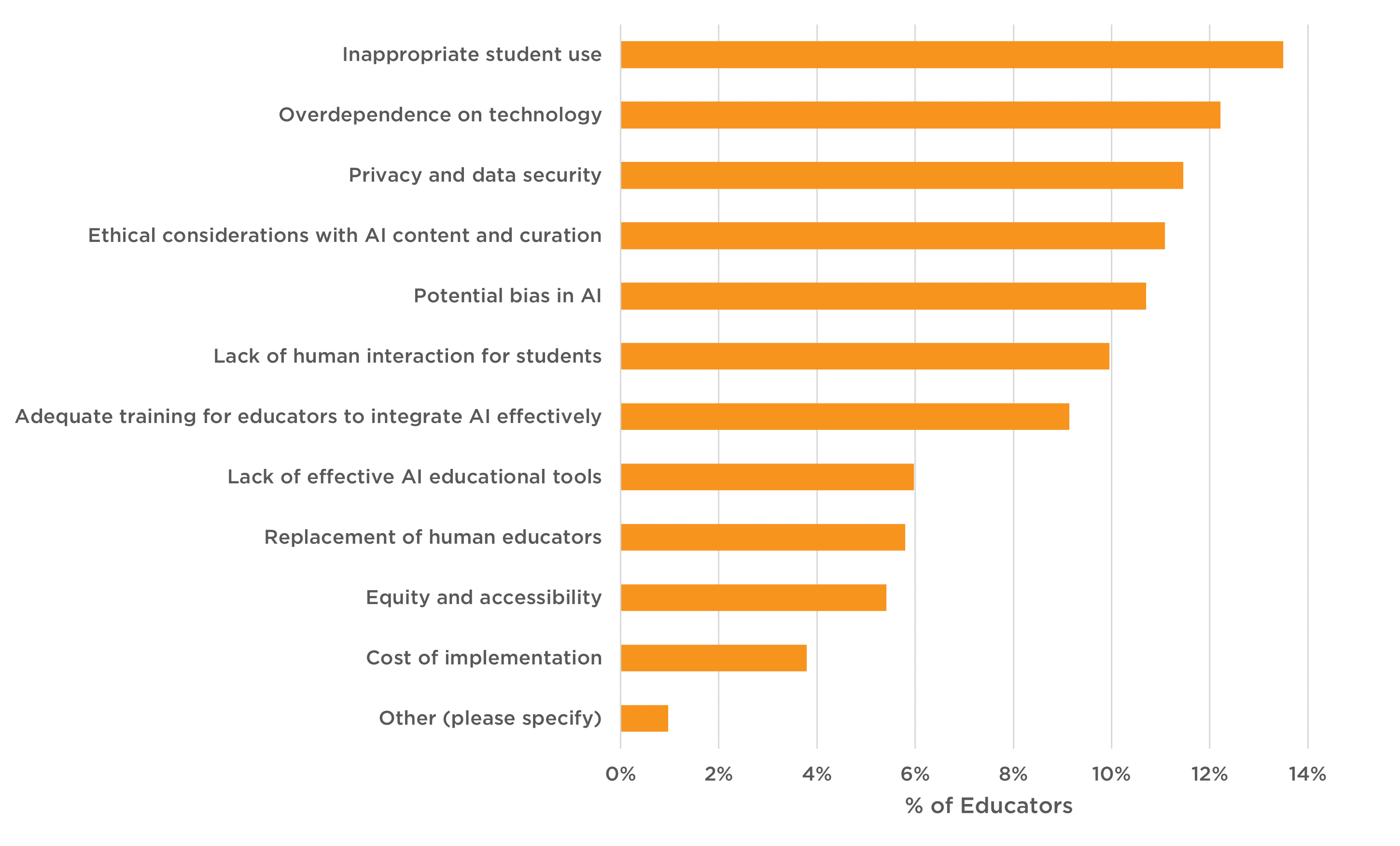 Educators were asked to select all the areas in which they were concerned about AI integration. Figure 8 provides a detailed look at their responses. More than 10% of educators reported concerns around inappropriate student use, overdependence on technology, privacy and data security, ethical considerations with AI content and curation, and potential bias in AI. Educators, while still concerned, reported being less concerned overall about the cost of implementation, equity and accessibility, replacement of human educators, and lack of effective AI education tools.
