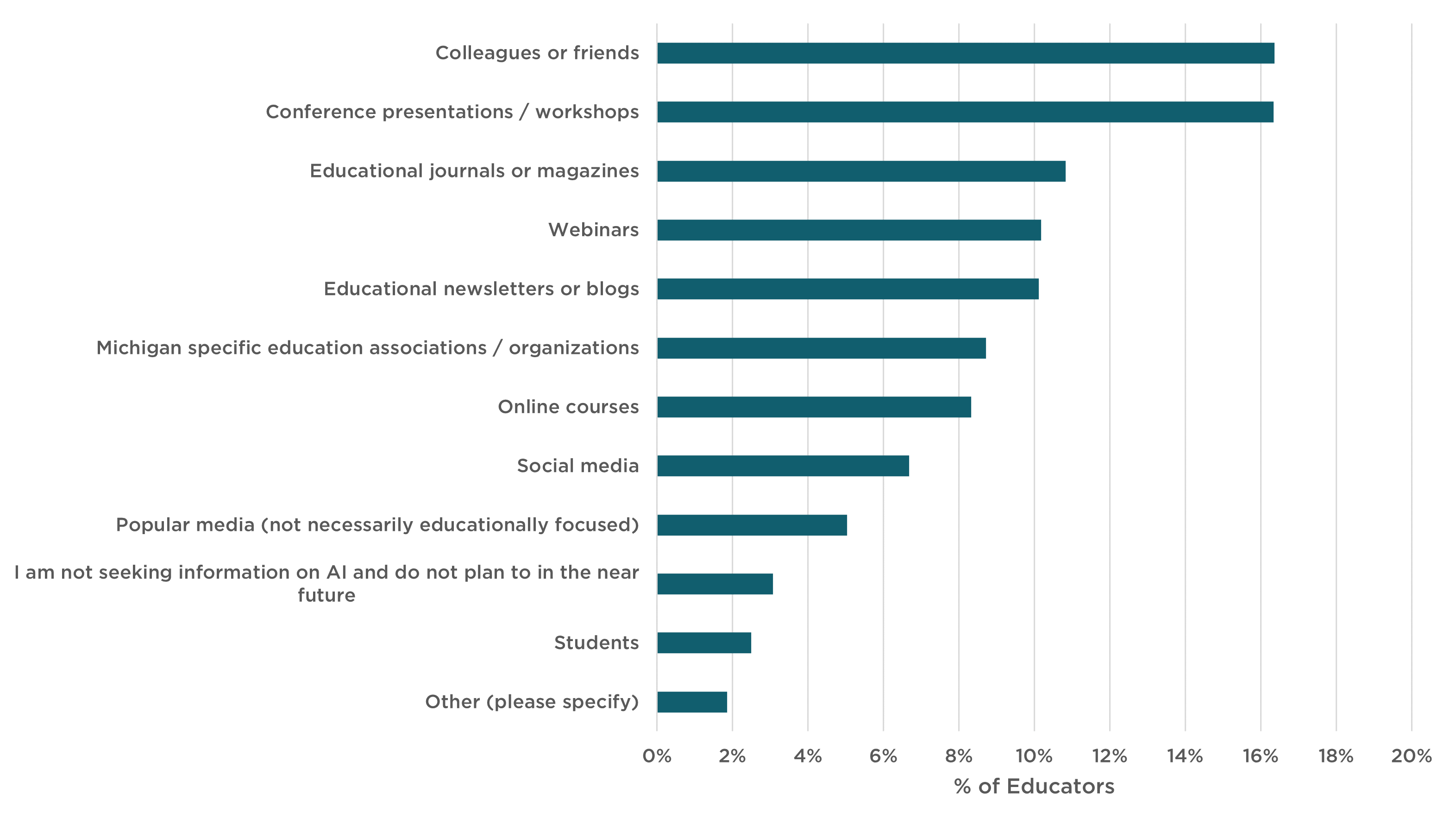 Additionally, educators were asked, where would you turn (or have you turned) for information on artificial intelligence (AI)? Figure 3 below provides a summary of their responses. Among the most popular places educators turned to for information on AI were their colleagues or friends and conference presentations/workshops–with over 16% of educators reportedly using either or both. This finding is aligned with previous research where educators reported a preference for informal peer mentoring over professional development options such as conferences, webinars, and online courses. Far fewer educators reported using sources like social media, popular media, or students for information on AI.