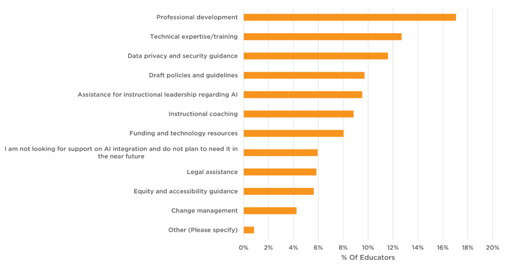 To understand how to better support teachers and schools in AI implementation, educators were asked, in what areas do you need support for integrating artificial intelligence (AI) into your school/district. Figure 10 below details their responses. At the top of the list was a need for support around professional development, followed by technical expertise/training–two areas that are closely aligned. Educators also responded and identified a need for assistance with AI policy, specifically guidance around data privacy and security, as well as draft AI policies and guidelines.