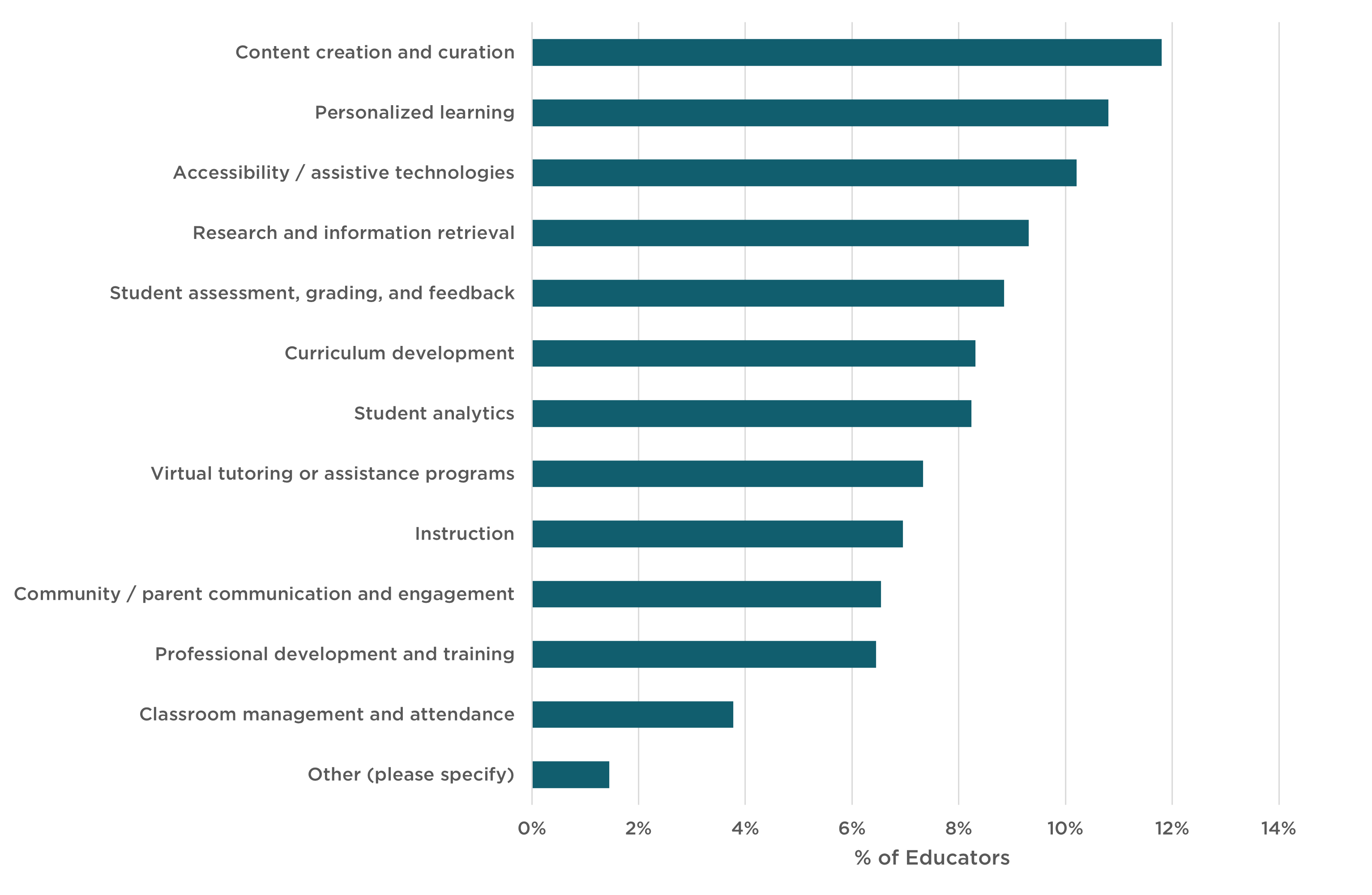 We also asked all educators in what areas they think AI can be a useful tool. The results are detailed in Figure 9 above. Educators seemed most optimistic about AI assisting with content creation and curation, personalized learning, and accessibility/assistive technology. Educators seemed most optimistic about AI’s ability to help them personalize and differentiate learning and make their content and curriculum more accessible. Teachers seemed less optimistic about AI assisting with some of the more “interpersonal” aspects of teaching such as virtual tutoring or assistance programs, instruction, and community/parent communication and engagement.