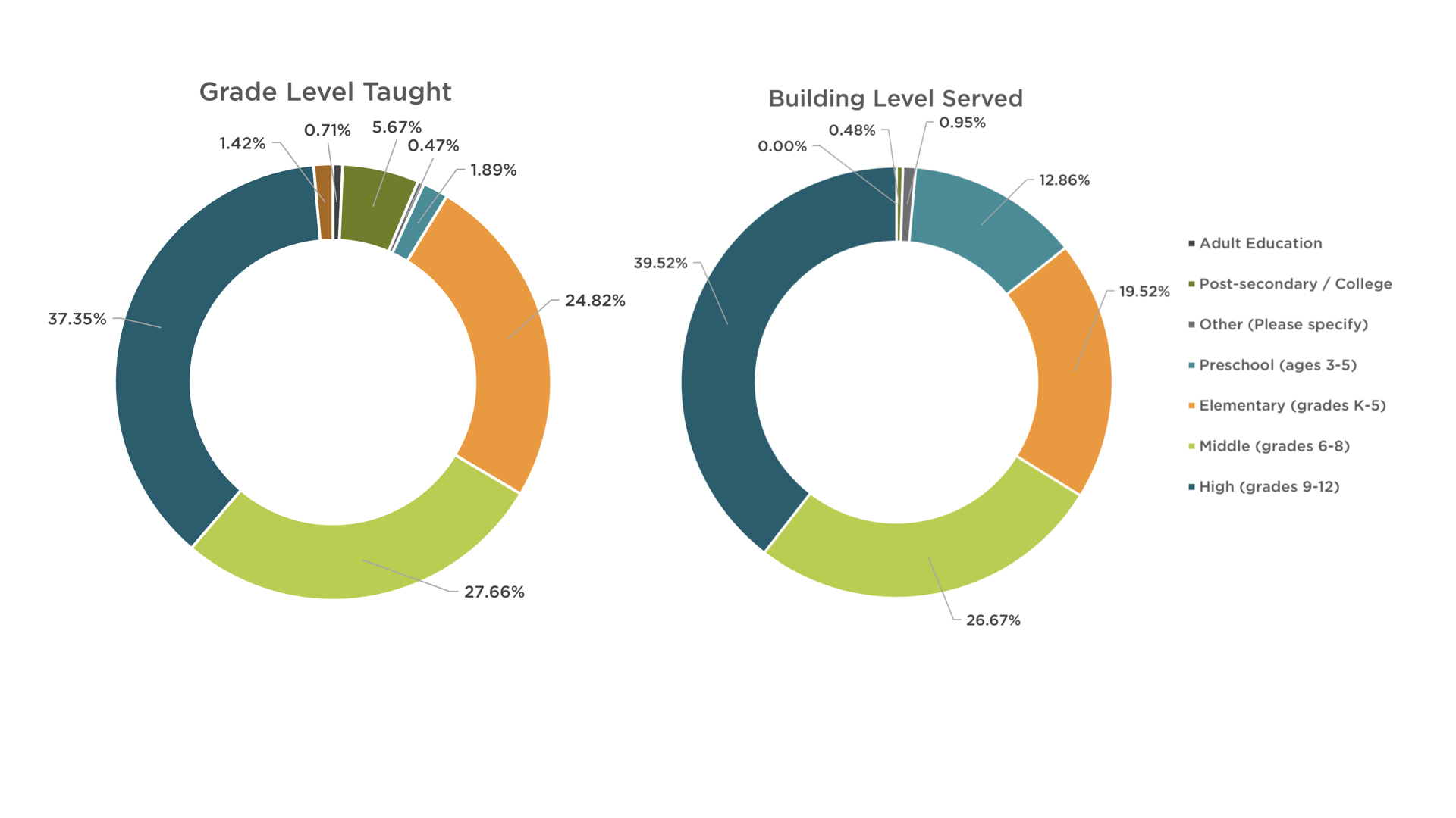 If educators indicated they were teachers or building principals/assistant principals they were asked to identify the grade levels they currently taught or the building levels they currently served. Figure 2 below details these responses. Elementary, middle, and high school teachers were well represented, with a smaller number of respondents in adult education, post-secondary/college, preschool, and career and technical education.