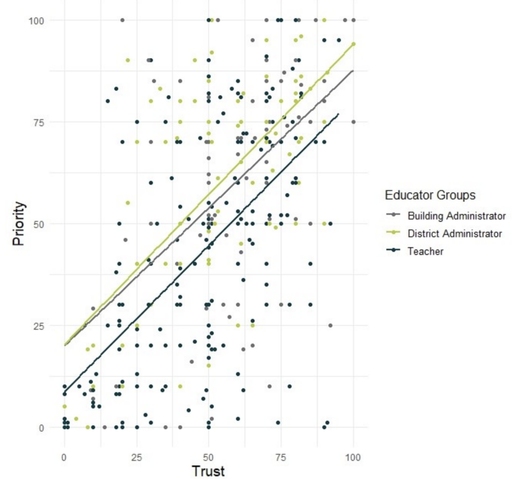 Finally, we looked at the level of trust in AI alongside the level of priority educators placed on AI integration shown in Figure 7. Educators were asked to indicate on the same 0 to 100 scale, what level of priority they place on artificial intelligence (AI) integration in education today. Teachers indicated the lowest level of priority of AI integration, much less than both building and district administrators who both had mean scores above 50. The scatterplot (Figure 7) shows a positive relationship between trust and priority—as trust increases, the priority placed on integrating AI also increases. Teachers reported the lowest levels of trust in AI and the lowest priority for AI integration. Both building administrators and district administrators started at similar levels of trust and prioritization; however, as district administrators' trust increased, the priority they placed on AI integration slightly surpassed that of building administrators. Educators who have a high level of trust in AI may place increased priority on integration because of the perceived benefits of use, while those with lower levels of trust may be hesitant to place a high priority on integration due to perceived drawbacks and concerns.