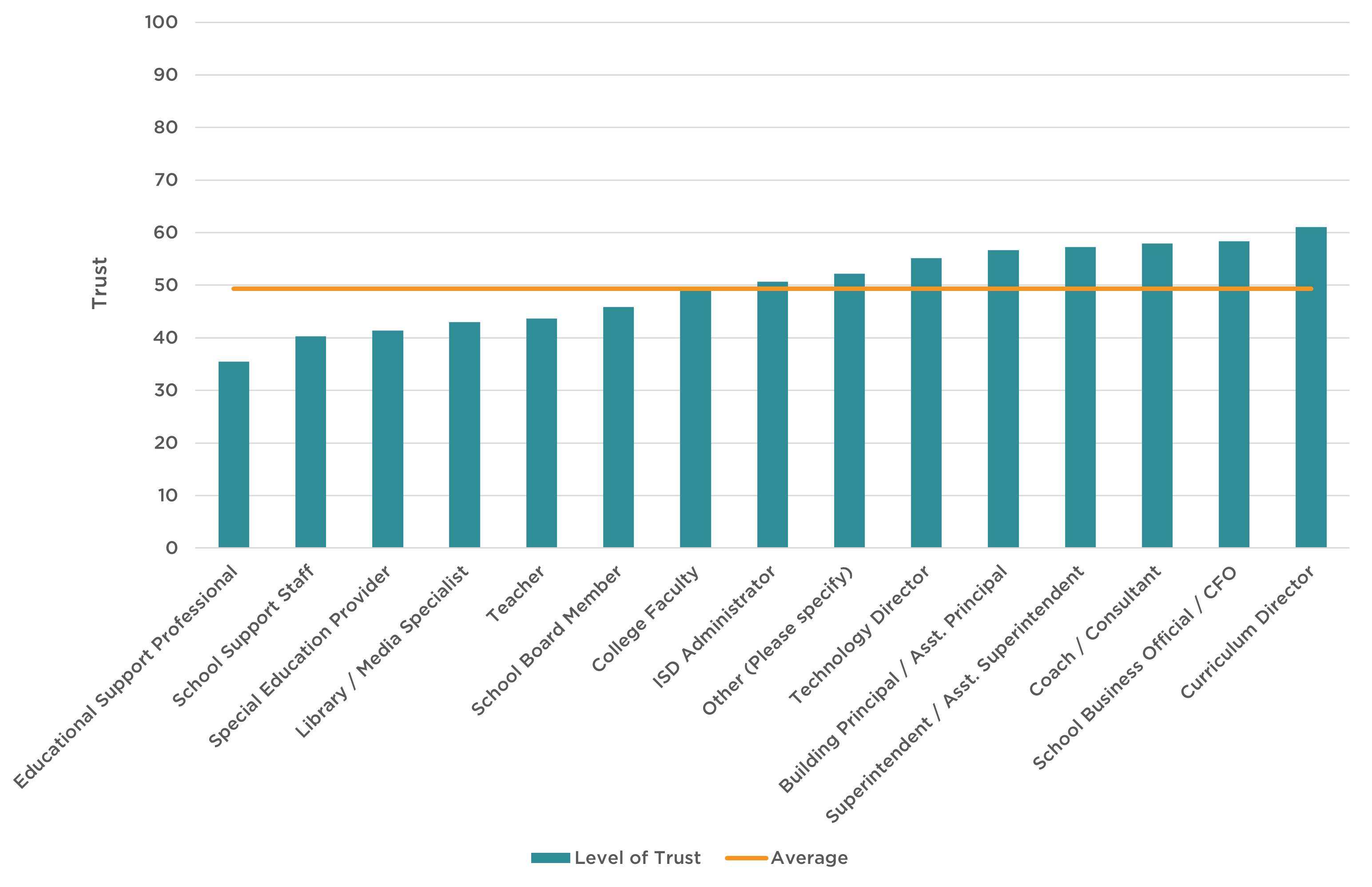Figure 5 below details the level of trust by role relative to the average level of trust reported by all educators. Curriculum directors (61.1), school business officials/CFO (58.3), coaches/consultants (59.7), and superintendents/assistant superintendents (57.2) on average reported the highest levels of trust in AI. Conversely, educational support professionals (35.5), school support staff (40.3), and library/media specialists (43.0) had the lowest trust. It is important to note, however, that these roles accounted for only 47 out of 1,055 responses. Teachers had the 5th lowest trust in AI with a mean of 43.7.