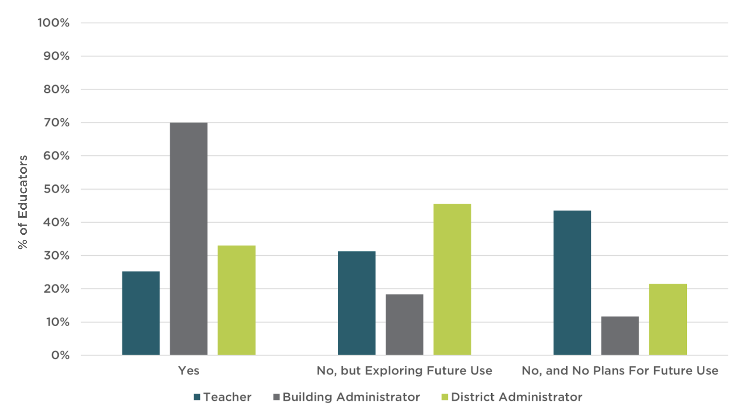 Educators were asked if they were using AI in their classroom (teachers), or if teachers were using AI in their school (building administrators and district administrators).