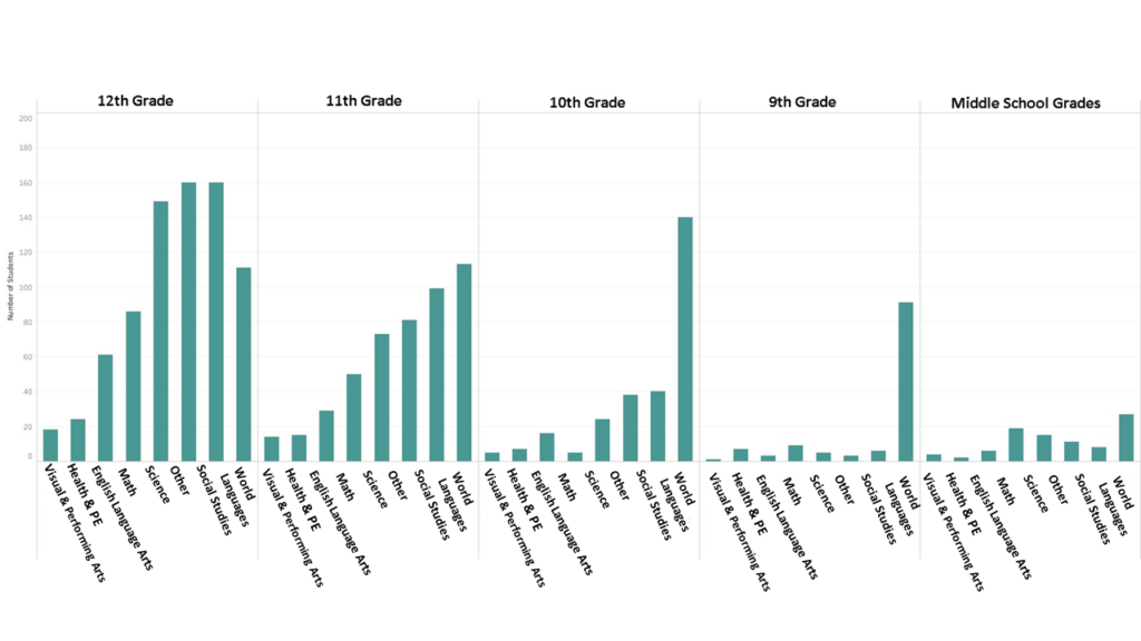 Regardless of grade, most students tended to be represented in the World Languages courses, with 12th and 11th graders also displaying comparable enrollments in Social Studies, Science, and Other courses.